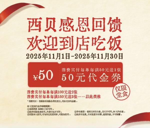 10月9日,西贝再次加码“满50元送50元券”勾当,此举之后,部门门店以至呈现火爆列队的气象。11月7日,勾当还正在继续,西贝号发文称“到店消费实付每满50元送50元”,无效期至11月30日。