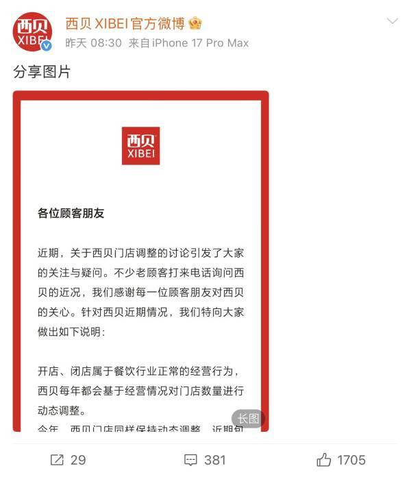 对此,西贝发布最新申明:开店、闭店属于餐饮行业一般的运营行为,西贝每年城市基于运营环境对门店数量前进履态调整。本年,西贝门店同样连结动态调整,近期包罗深圳、汕头、义乌等地门店闭店,均属于一般调整范围。